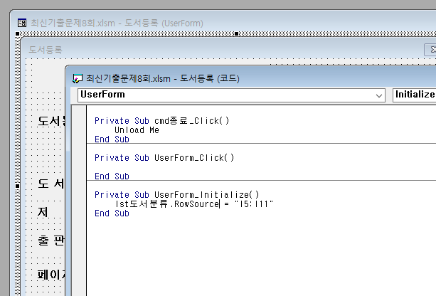 - <도서등록> 폼이 초기화되면 [I5:I11] 영역의 내용이 '도서분류(lst도서분류)' 목록 상자의 목록에 표시되도록 프로시저를 작성하시오