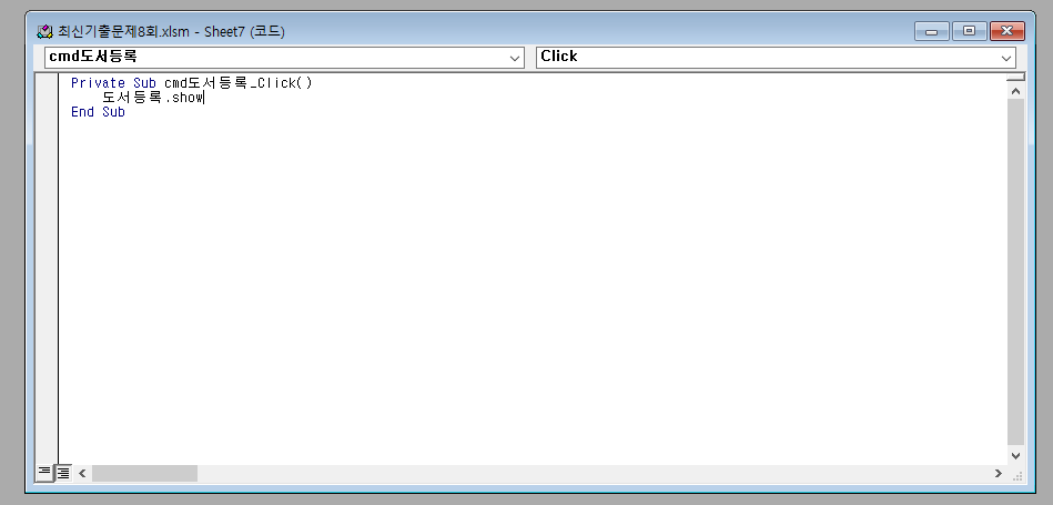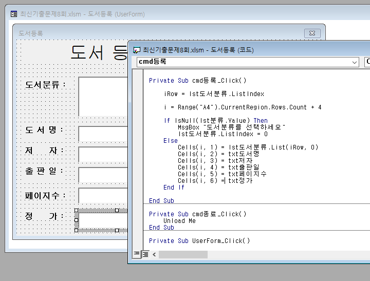 - '도서등록' 폼의 <등록(cmd등록)> 버튼을 클릭하면 입력된 데이터가 시트의 표에 입력되도록 프로시저를 작성하시오