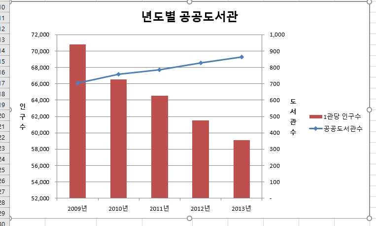 위의 차트처럼 두개로 줄였습니다. 그리고는 '공공도서관수' 계열의 차트 종류를 '표식이 있는 꺾은선형'으로 변경한 후 보조 축으로 지정합니다. 차트 제목과 각 축 제목을 <그림>과 같이 설정하면 됩니다.