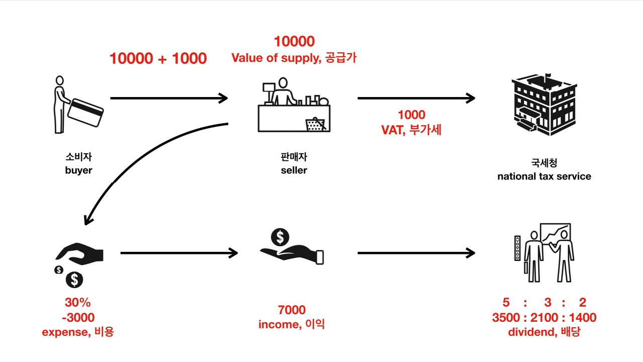 그리고 공급가의 10%만큼 소비자는 부가가치세(Value added tax)를 더 지불하고 판매자는 국세청에 부가가치세를 납부합니다.