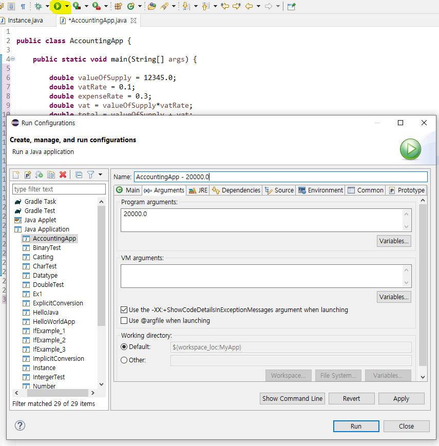 Java에서는 아규먼츠라고 하여 직접 입력값 설정을 해주는 것이 가능합니다.