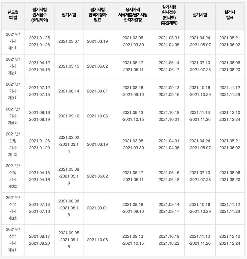 혹시 몰라 큐넷에 올라온 2021년 기사/산업기사 일정을 올려놓습니다!