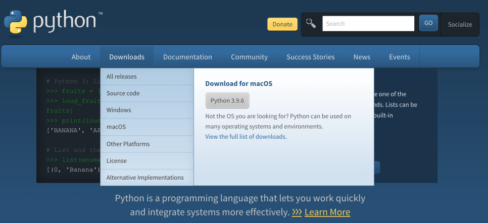 파이썬으로 프로그래밍을 하기 위해서는 파이썬을 설치해야합니다. 홈페이지에서 다운로드를 들어가 최신 파이썬을 다운로드 하면 됩니다. 맥 OS에서는 파이썬이 이미 설치되어있어서 따로 설치하지 않아도 됩니다.