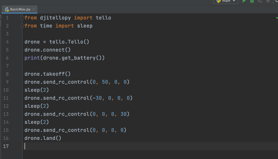간단히 짧은 코드를 작성해보았습니다. 여기서 send_rc_control(0,50,0,0)이 의미하는 것은 무엇일까요? 이륙한 뒤에 상하좌우로 움직이지 않고 앞으로만 50 이동한 후에 대기했다가 착륙하겠다는 의미입니다. sleep(2)는 2만큼 잠시 대기하겠다는 코드입니다. 한번 실행시켜보세요, 실제로 이륙하고 앞으로 움직였다가 멈춰서 착륙하는 것을 볼 수 있습니다.