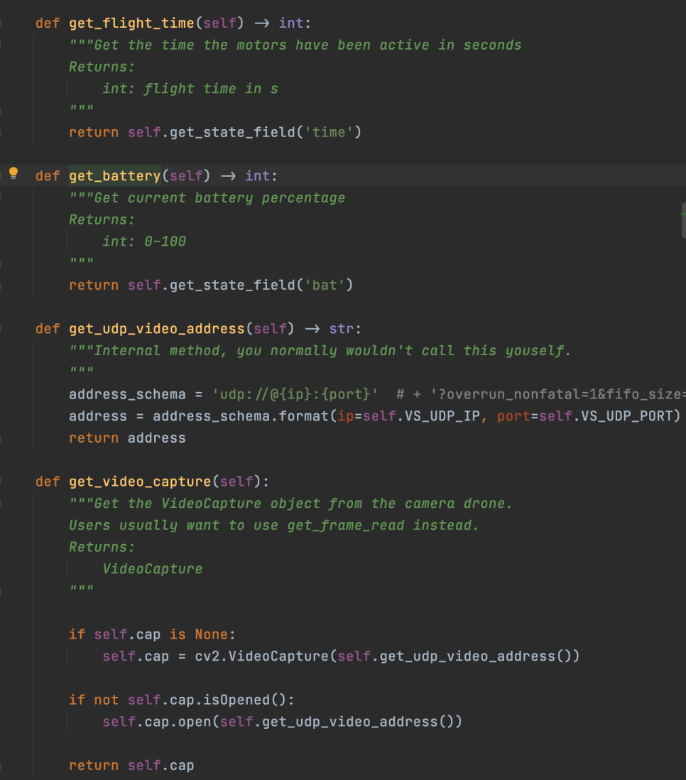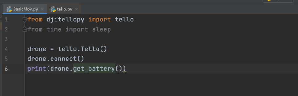 저는 제 드론 객체 이름을 drone 이라고 해주었고, tello.Tello() 를 사용하여 드론 객체를 생성해주었습니다.