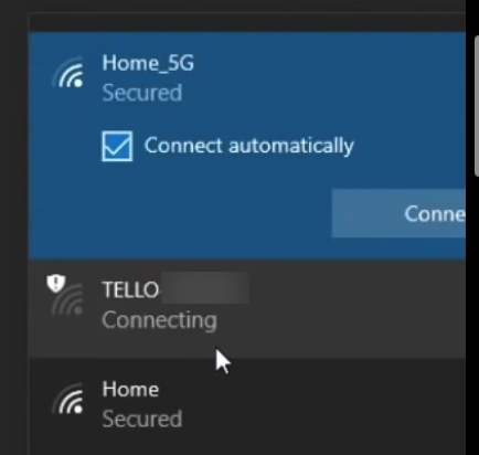 이제 실제로 드론을 켜서 노트북과 연결하는 과정이 필요합니다. 드론을 작동시키면 아래와 같이 와이파이가 잡히게 되고, 노트북과 연결할 수 있습니다. 와이파이로 연결하면, 드론과 노트북이 통신할 수 있게되며, 파이썬 코드로 드론을 프로그래밍 할 수 있습니다.